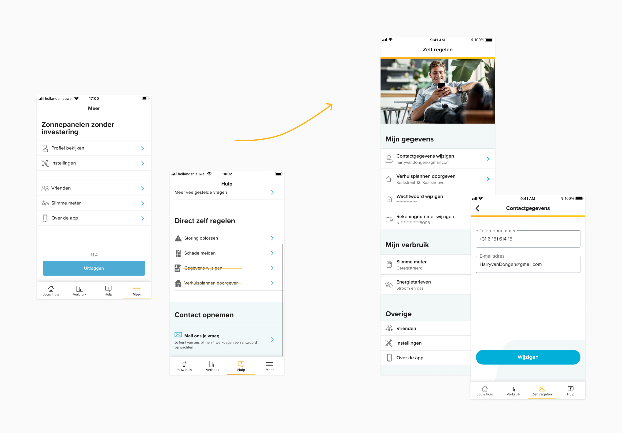 We transformeerden dus het ‘Meer’ menu en introduceerden hiermee een ‘Zelf regelen’ menu met in eerste instantie alleen de mogelijkheid om je eigen gegevens te wijzigen, zoals je e-mailadres, telefoonnummer, rekeningnummer en wachtwoord.