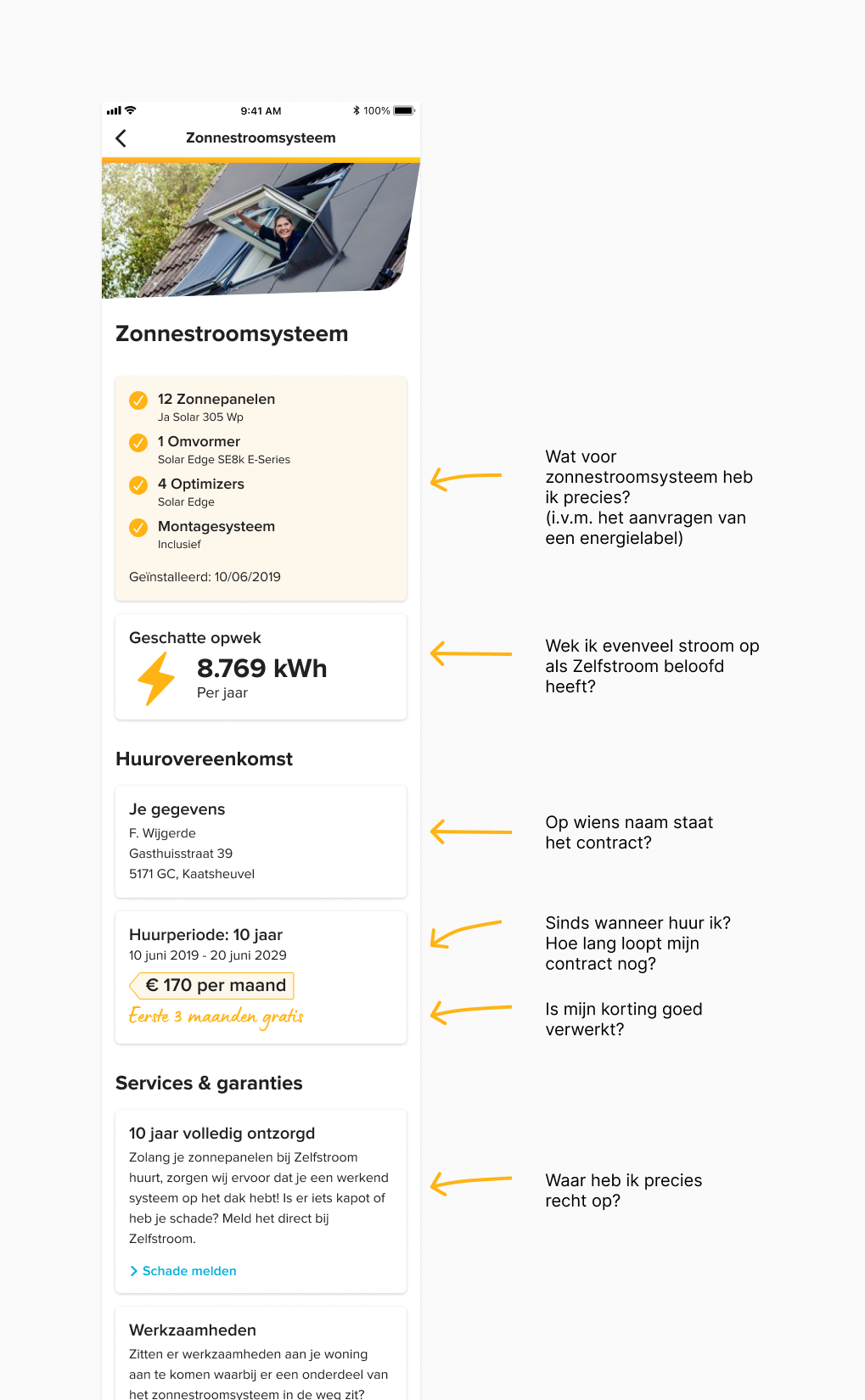 Een onderdeel dat ook veel vragen gaat afvangen en tegelijkertijd nodig is om de verhuisflow verder te ontwikkelen, is het tonen van de details van het zonnestroomsysteem en de contractgegevens.