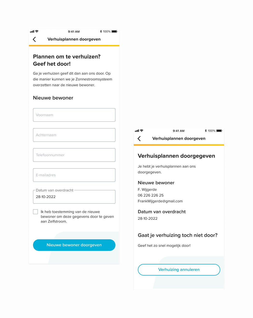In de app maakten we een onderscheid tussen huurklanten en koopklanten. Koopklanten krijgen het formulier hieronder te zien waarmee ze makkelijk de gegevens van de nieuwe bewoner door kunnen geven.